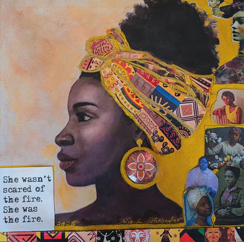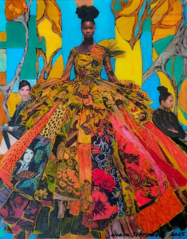 Drawing from historical photography and fashion imagery, the works construct visual narratives that emphasize presence, strength, and cultural legacy. Painted and assembled elements create dialogue between heritage and contemporary identity.