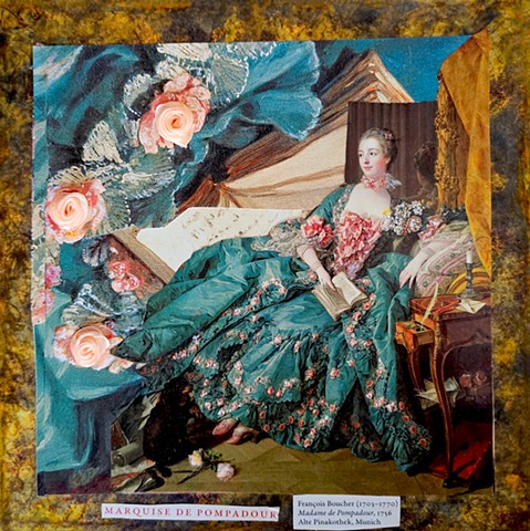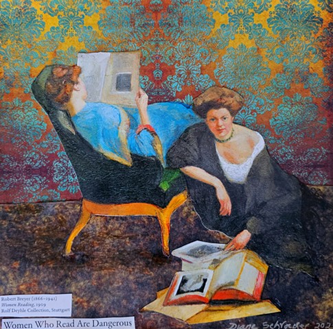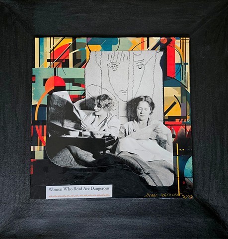 Fragments of historic portraits gather around quiet acts of reading and reflection. Through layered surfaces and reassembled imagery, the works honor women whose curiosity and intellect once unsettled expectations. Past voices linger within contemporary settings, suggesting that thought itself has always carried quiet power.
